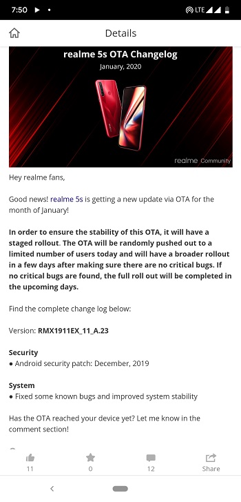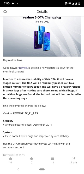 These are all OTA updates. As such, in true Realme fashion, it will have a staged rollout. This means that the OTA will be randomly pushed out to a limited number of users. This will then be followed by a broader rollout in a few days after making sure there are no critical bugs.