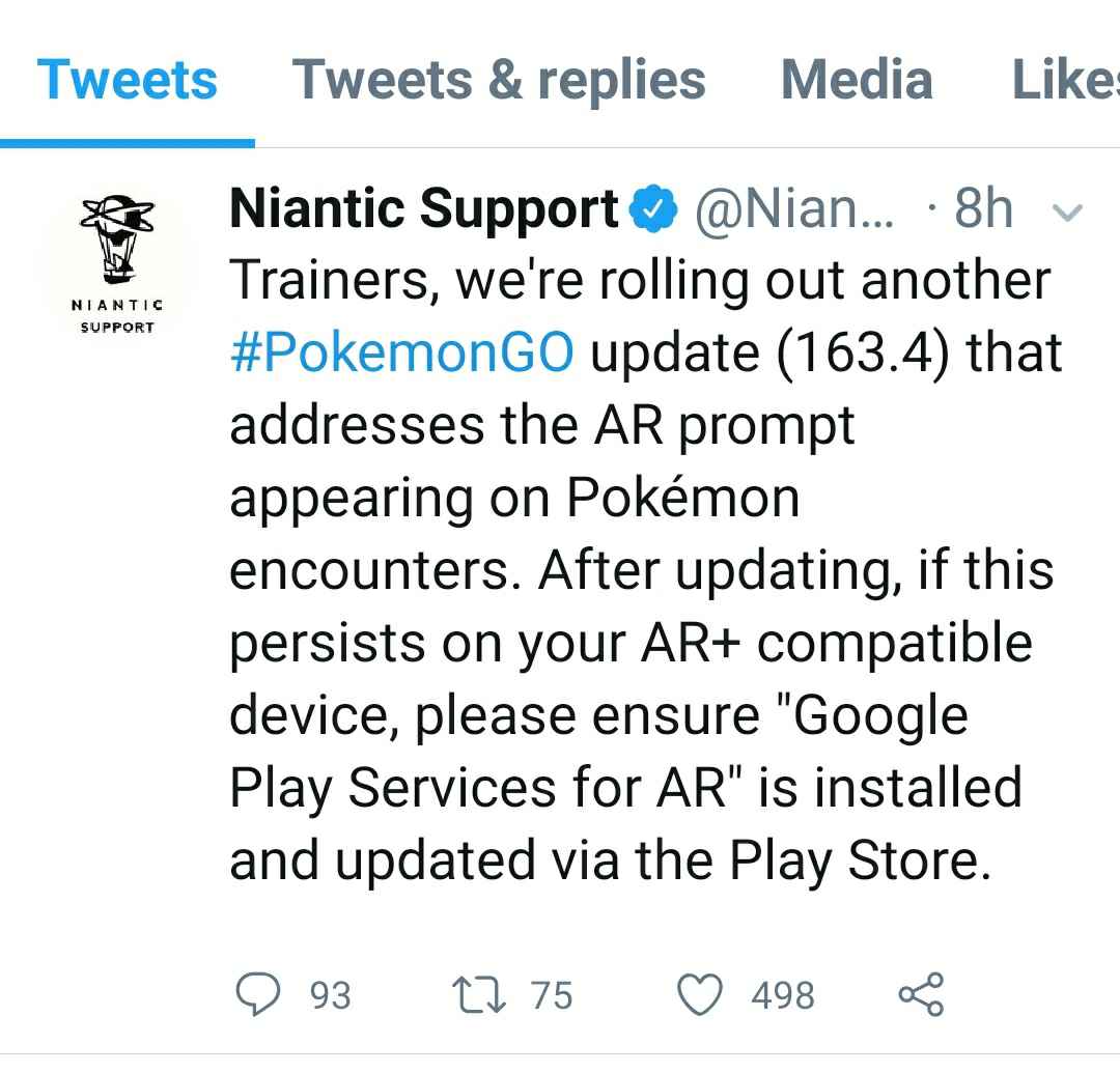 Now, with the latest update, Niantic has resolved AR Mode issues & the company took the route of Twitter to confirm it in an official statement. According to the official statement, Pokemon Go update 0.163.4 has addressed the AR Prompt appearing on Pokemon encounters. Have a look at the official statement down below.