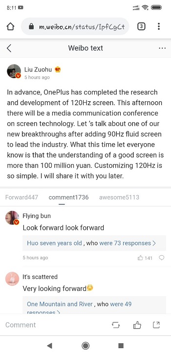 The event is slated for today, January 13th. A few hours to the event, OnePlus CEO Pete Lau has confirmed that the company has completed research and development of a 120Hz display panel.