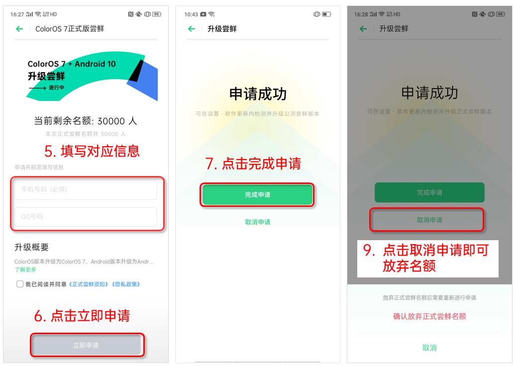 - Click on upgrade to early adopters, click ColorOS 7 to limit early adopters, fill in the corresponding information, read the early adopters notice and privacy policy, click Apply Now, to complete the application.