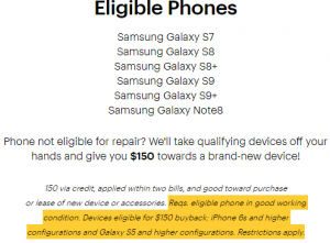 But there’s a catch. The devices eligible for this $150 buyback are iPhone 6s and higher configurations and Galaxy S5 and higher configurations. Here’s how Sprint puts this.