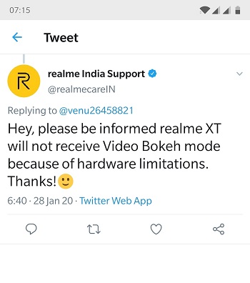 Realme XT video bokeh mode not coming due to hardware limitations, company confirms