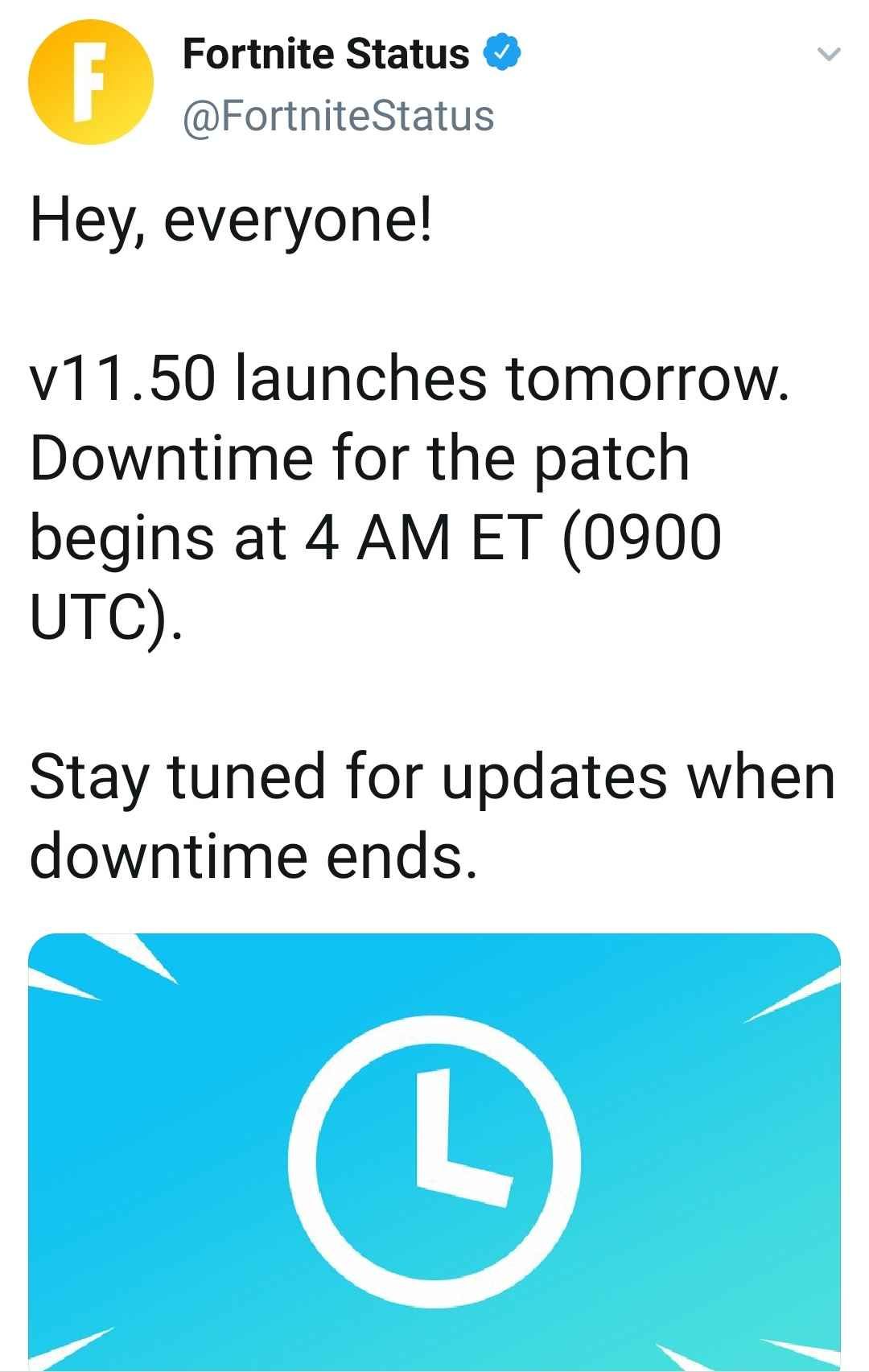 Fortnite update v11.50 has been scheduled to release on Wednesday, February 4 at the usual time of 1 am PT / 4 am ET / 9 am GMT. There will be a downtime of 20 minutes for this new update. This information was revealed on the Fortnite Status Twitter handle. Have a look at the tweet down below.