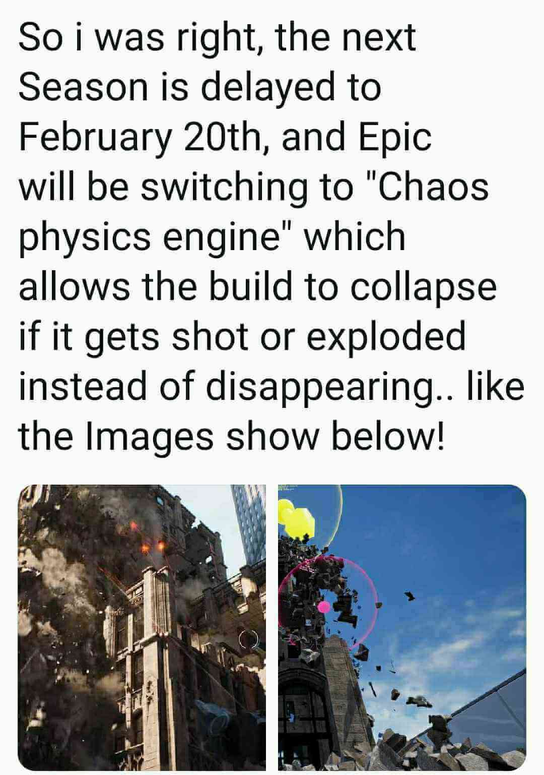 However, Epic Games has ensured that, Fortnite will still feel like Fortnite. A popular Fortnite leaker, Hypex has hinted some changes that will be seen in the forthcoming update. Have a look at the image below showcasing the difference, how the building explosion will feel with the new Chaos Physics Engine.
