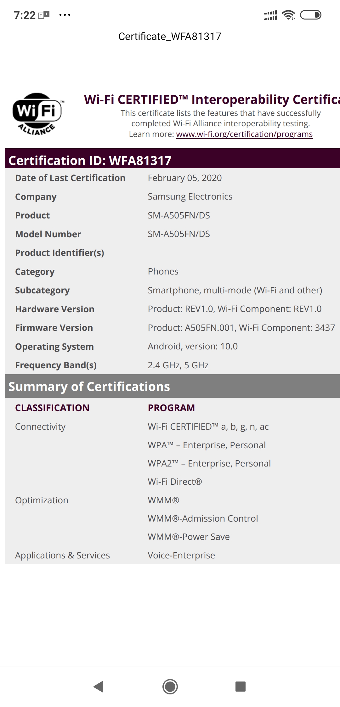 According to papers from the Wi-Fi Alliance, the Galaxy A50 running on Android 10 has just received Wi-Fi certification.