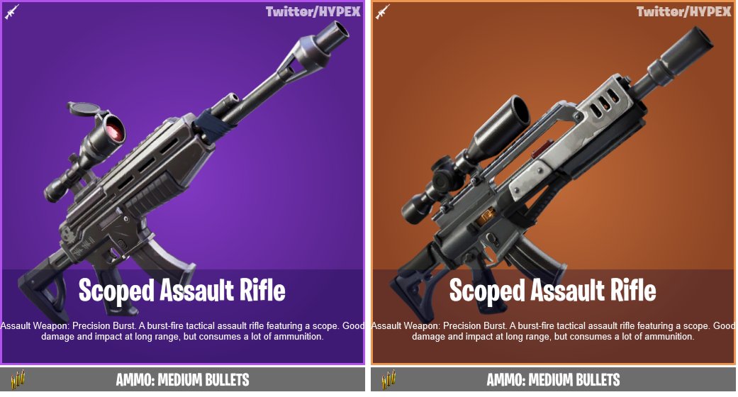 Fortnite update v12.20 is also expected to add Scoped Assault Rifle to the game. The official description of this weapon reads as follows: Precision Burst: A burst-fire tactical assault rifle featuring a scope. Good damage and impact at long range, but consumes a lot of ammunition.