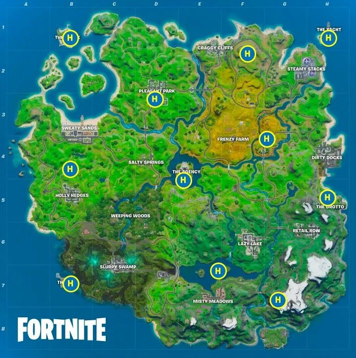 The first of the helipads can be found on the east side of The Rig, with another fairly nearby on the north-west side of The Shark Base. In Pleasant Park, the old soccer field has been transformed into a bunker, complete with a helipad, and another can be found in the centre of The Grotto.