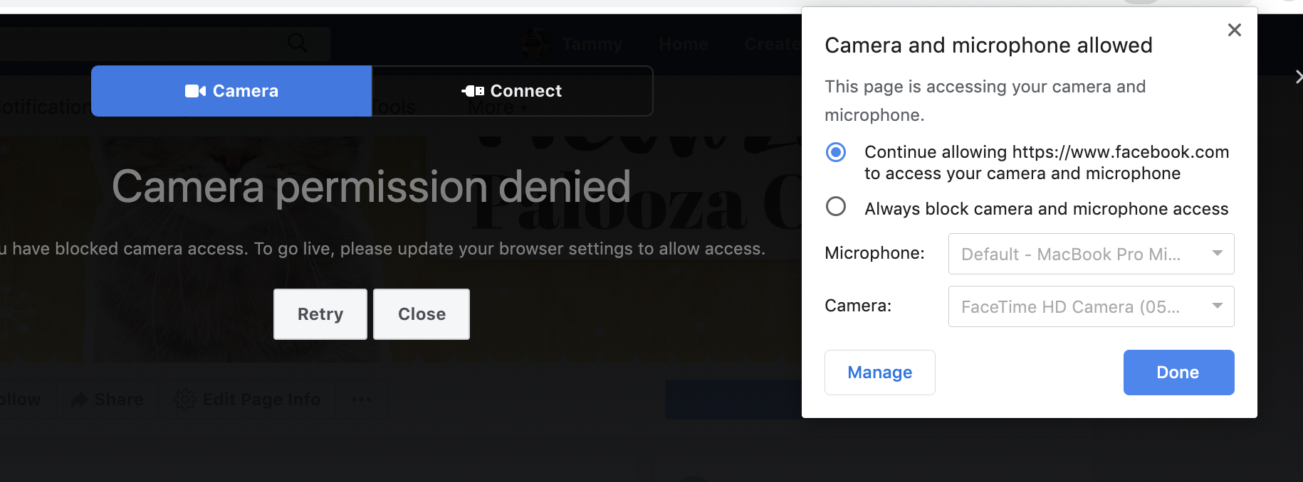 5. Once you’ve done all these things, restart Chrome one more time, go to your Facebook page, click on “Live Video” and select “Camera” and you should now have the option on the bottom left to Go “Live”.