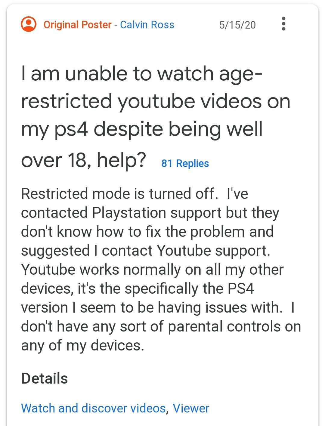 Cut to now, many players on PS4 are currently having issues while accessing YouTube. They are unable to watch age-restricted videos on the platform, even when the Restricted Mode feature is turned off. This issue was first raised by Calvin Ross on May 15, 2020. Have a look at its screenshot down below.
