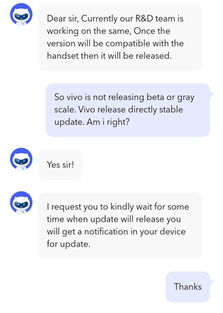 A Twitter user shared a screenshot of what appears to be a conversation between him and the Vivo support team. From the conversation, it seems as though the Vivo Y17 was to receive the stable Android 10 update directly with no grayscale (soak test), or beta rollout first.