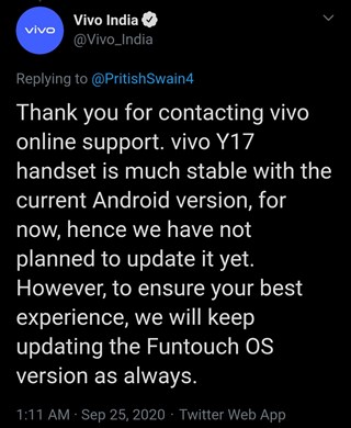 Making matters more complicated, Vivo India responded to a user’s query regarding the Android 10 update for the Vivo Y17 by stating that Vivo has not planned to update the device yet. Here’s the entire response: