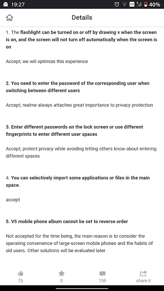 Apart from this, the OEM has addressed some of the feature requests sent by Realme users. Realme has accepted most user requests related to the optimization of flashlight gesture, multi-user security enhancements, integration of WiFi and personal hotspot, Weather app optimizations and more.