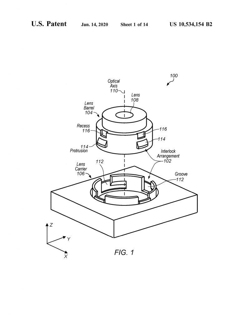 The summary of Apple’s latest invention states that in some embodiments, the interlock arrangement may restrict the movement of the lens barrel relative to the lens carrier along at least an optical axis. In various examples, the interlock arrangement may include one or more grooves and one or more protrusions.
