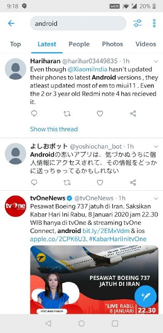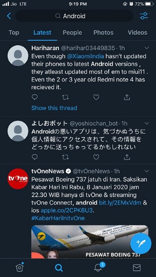 So yes, the Twitter search isn’t working right now on both app and web, and all you get to see is an hour old search results. Following are a couple of screenshots taken from iOS (left) and Android (right) reflecting what we get in the latest section on searching for “Android”: